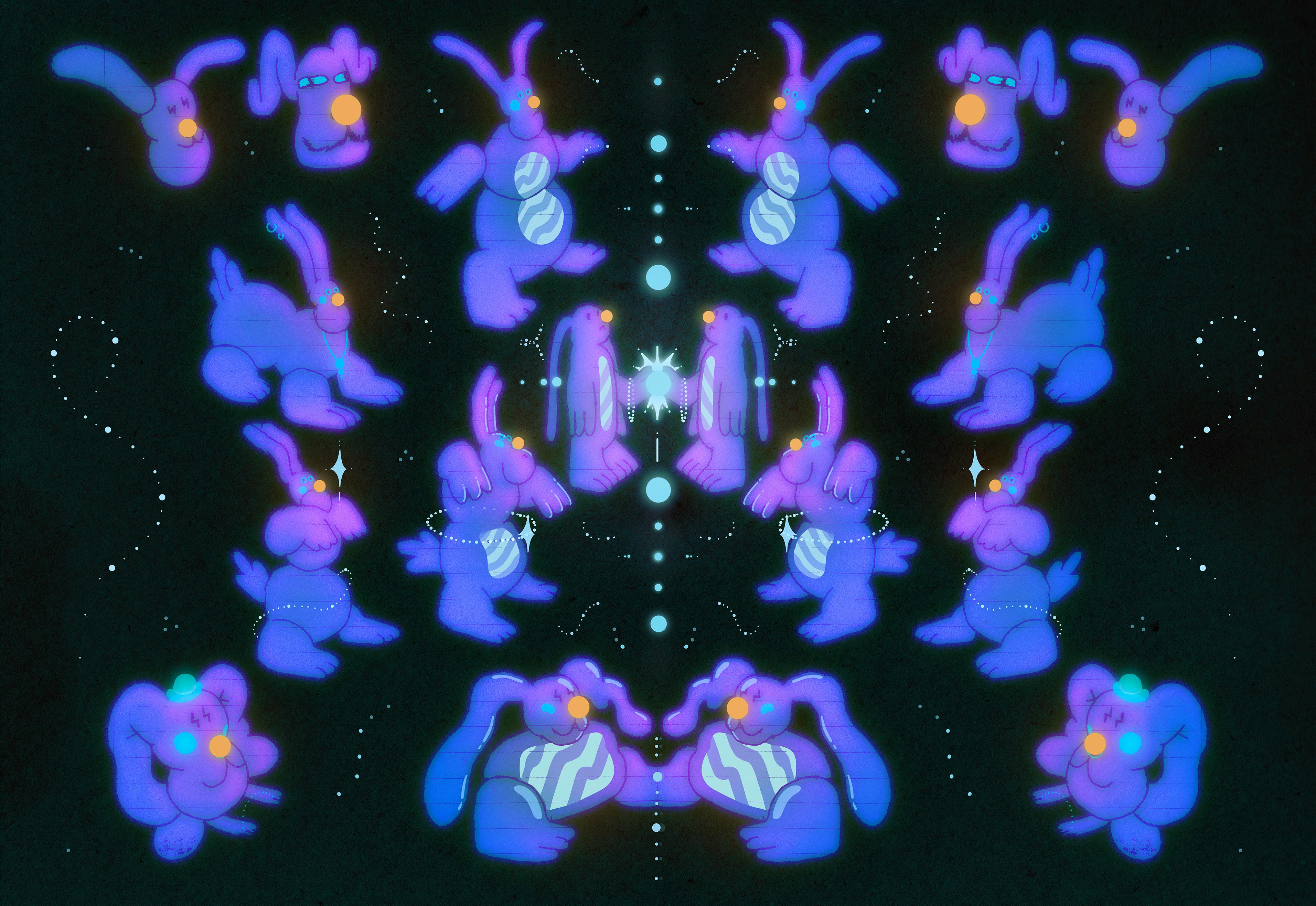Childhood cartoons fuel Juan’s world: from Rocko’s Modern Life to Hello Kitty and the Teletubbies. You can trace this playfulness in his process: hand-drawings which bloom into dizzying rhythms. 90s nostalgia meets late-night TV shows meets heat-hazed highways, in an “exploration of movement’s plasticity.”